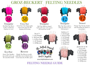 We carry our own line of GROZ-BECKERT felting needles that have been color coded specifically for The Felted Desert to help you find the right needle for the right job every time. We have a color coded chart, and color coded needle cards that come with your needles to show you the size & shape & what each needle is best used for, so that you can get the best results for your felting projects.