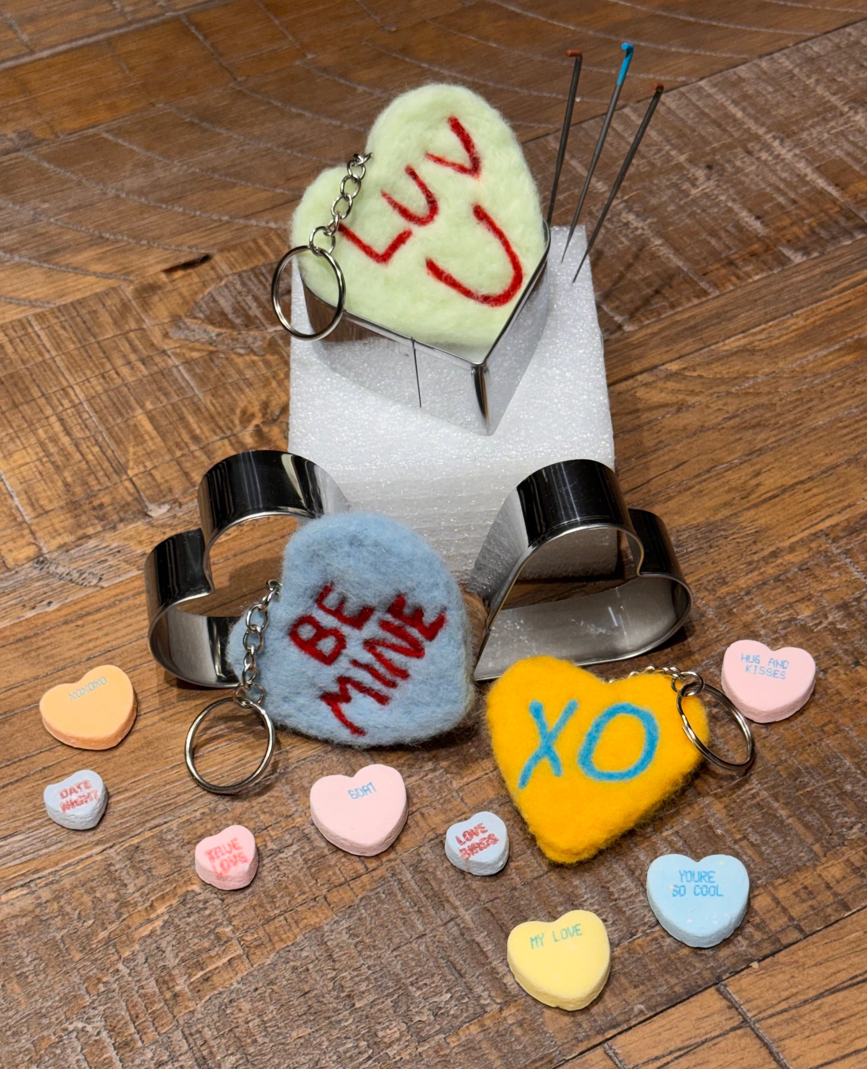Just in time for Valentine’s Day is our Valentine’s Sweetheart Keychain Kit. This kit is perfect for kids (10 or older with supervision) to learn to felt, or anyone who has never felted and wants to learn with a simple easy to learn project. This is also perfect for anyone looking for a fun kit for Valentine’s Day to give as a great gift to someone who wants to learn to felt. We all remember those heart shaped candies with the words on them. Well this felting kit makes three heart shaped keychains that will remind you of those candies. They are the perfect little gifts to make and pass along to someone you are sweet on.