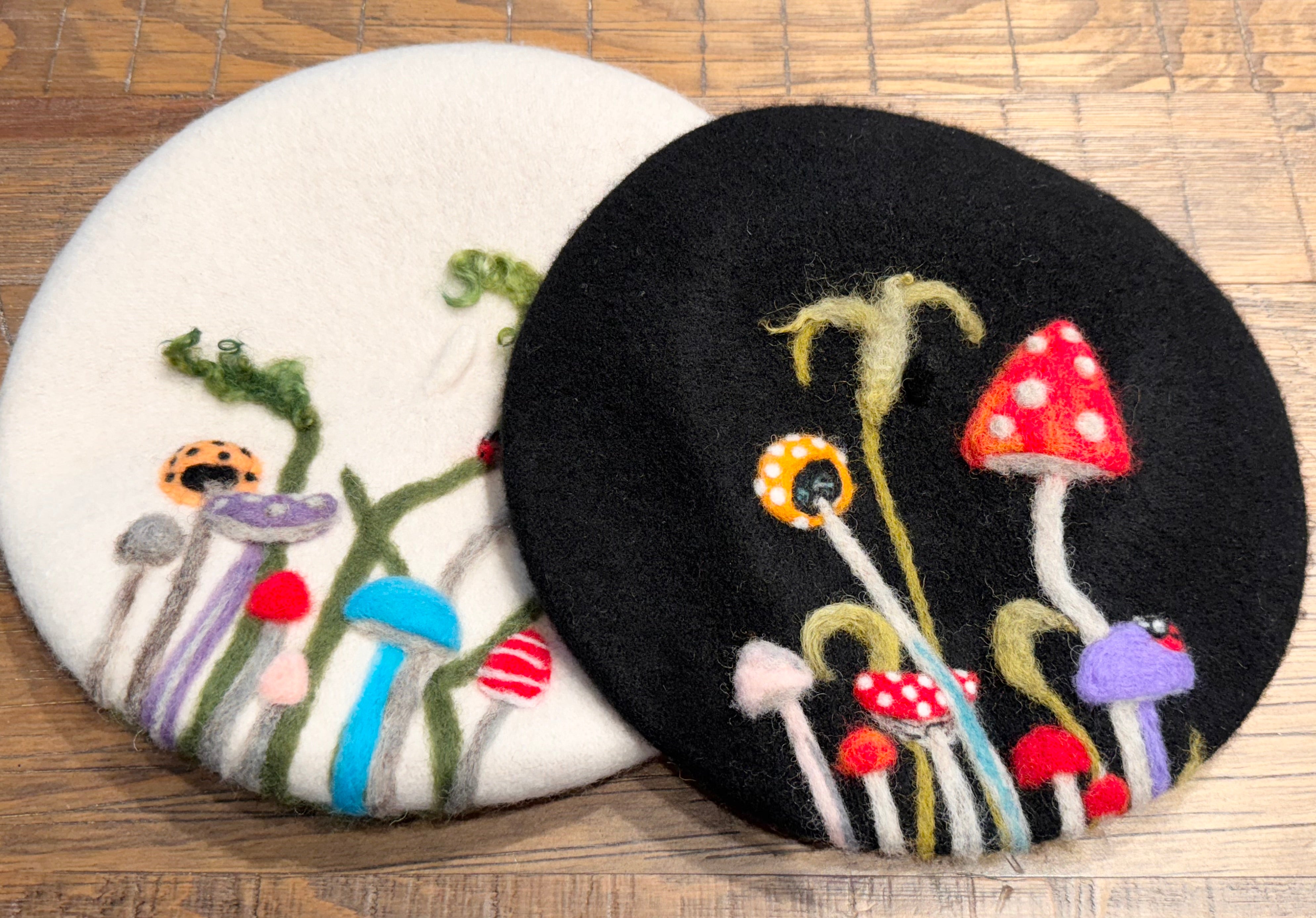 Join me for a wonderful beginner’s Wine & Wool needle felting class. In this class you will choose a beautiful French Beret/Tam in your choice of Black or Cream, and then felt a gorgeous mushroom garden on it, while learning the basics of needle felting. At the end of this class you will have a lovely finished project that you will be proud to wear home.