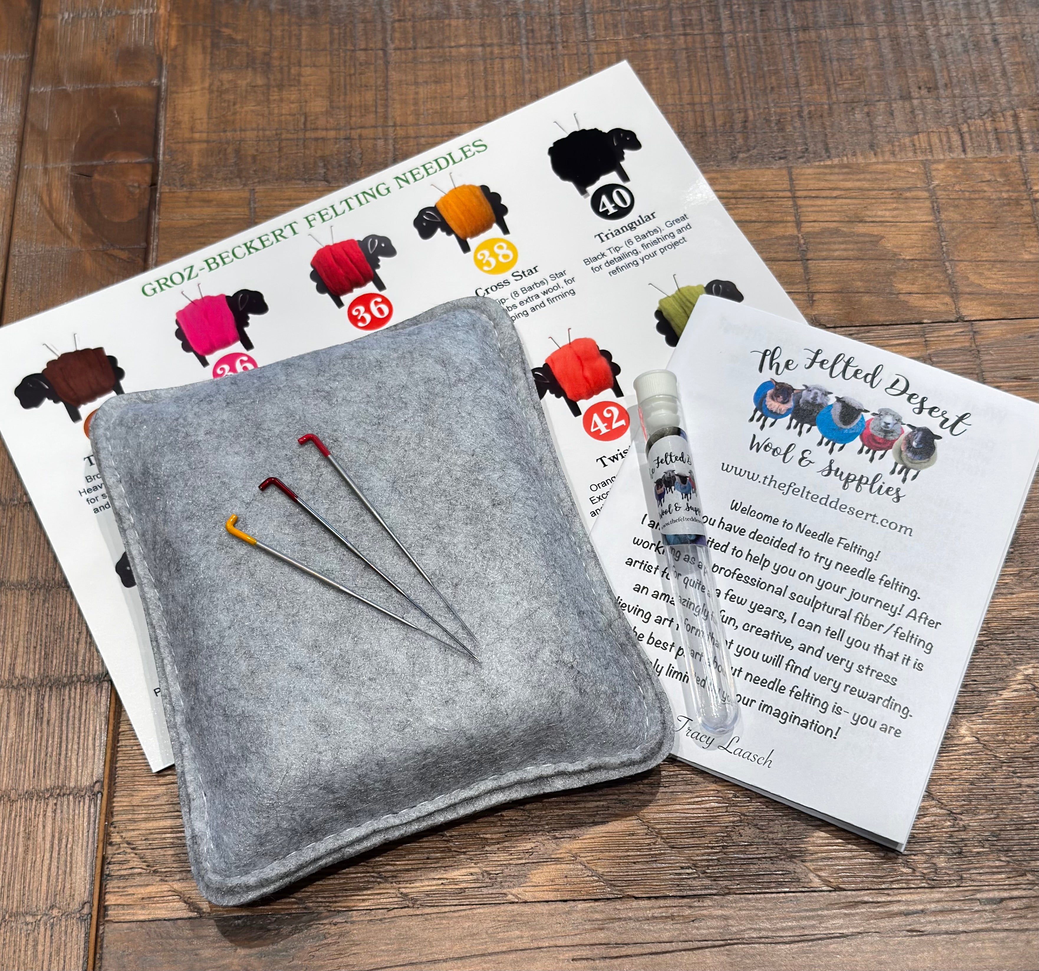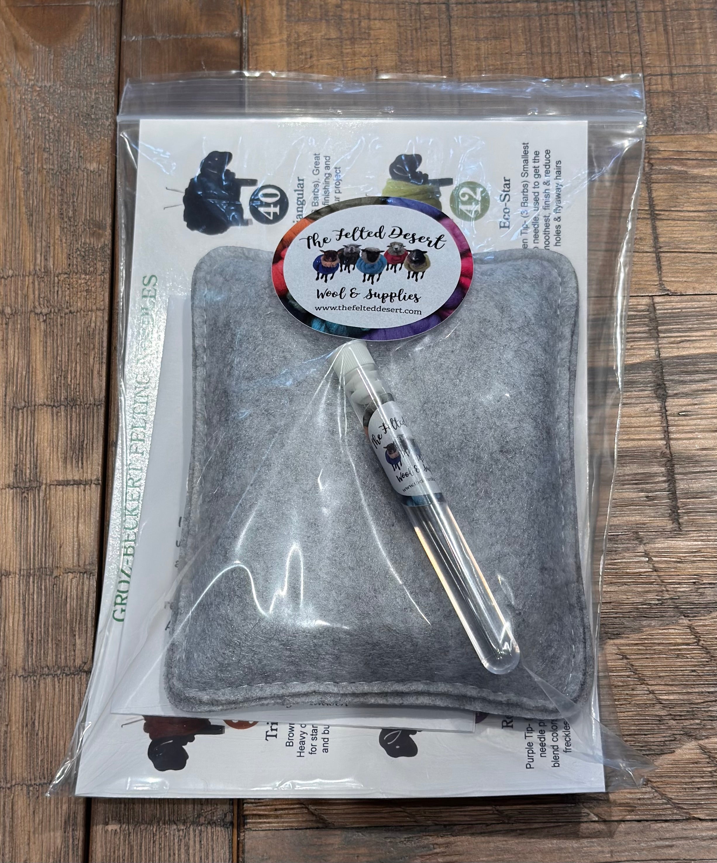 This mini mat & needle combo set comes with a mini 5 1/4” x 6 1/4” grey felting mat, and 3 of our Groz-Beckert felting needles including our Hot Pink 36 Triangular, our 38 Gauge Yellow Cross-Star, and Our Red 36 Triangular. It is a great set to get you started needle felting. Also included is our get started needle felting guide and our color coded Needle Guide Card which tells you what each of the needles are used for.